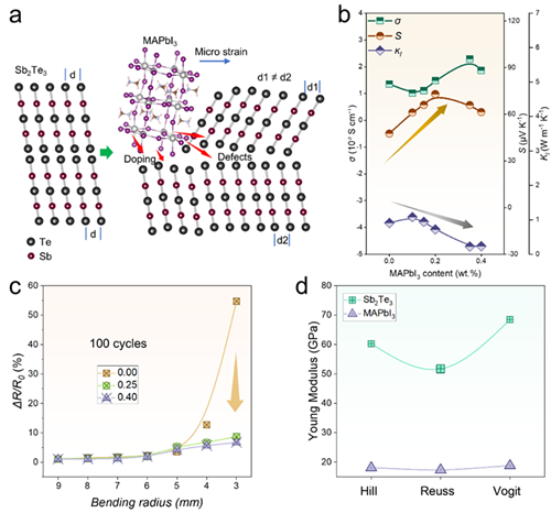 随着可穿戴设备和柔性电子的迅猛发展,热电材料作为实现自供能器件的核心功能单元,正日益受到研究人员的关注。在当前全球能源结构亟需向绿色、可持续方向转型的背景下,热电技术因其可直接将热能转化为电能,为低碳能源利用提供了新路径。然而,传统热电材料在实现高性能与柔性的兼容性方面仍面临巨大挑战。因此,罗景庭教授和郑壮豪特聘教授团队提出了一种创新策略,通过引入有机-无机杂化钙钛矿材料MAPbI3到层状Sb2Te3薄膜中,实现了热电性能与机械柔性的协同增强。研究显示,MAPbI3在原子尺度上诱发了Sb2Te3晶体结构的有序调控,有效抑制了(015)晶面生长,同时增强了(00l)晶面取向,从而优化了载流子迁移路径,显著提升了电子输运能力。在界面处,MAPbI3分解产物中的Pb和I元素进一步实现了掺杂调控,有效降低了载流子浓度,提高了Seebeck系数。与此同时,材料内部形成的大角度晶界等晶格缺陷加强了声子散射,显著降低了晶格热导率。在多重机制协同作用下,Sb2Te3薄膜在250℃时的热电优值zT从原始的0.20提升至0.47。更为重要的是,MAPbI3的低杨氏模量使得复合薄膜在多次弯折后仍能保持优异的导电性能,其柔性性能在100次弯折循环后的电阻变化率从54.6%降至8.7%。此外,基于p型Sb2Te3与n型Bi2Te3构建的热电器件在10K温差下实现了33.5nW的输出功率,验证了其在可穿戴能源采集领域的应用潜力。